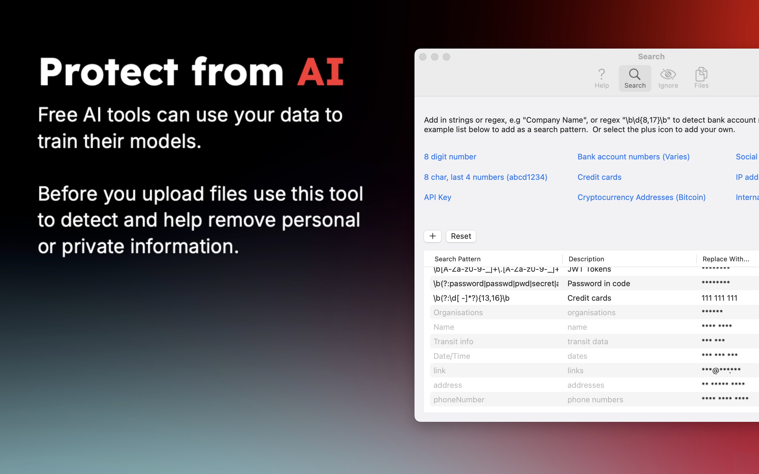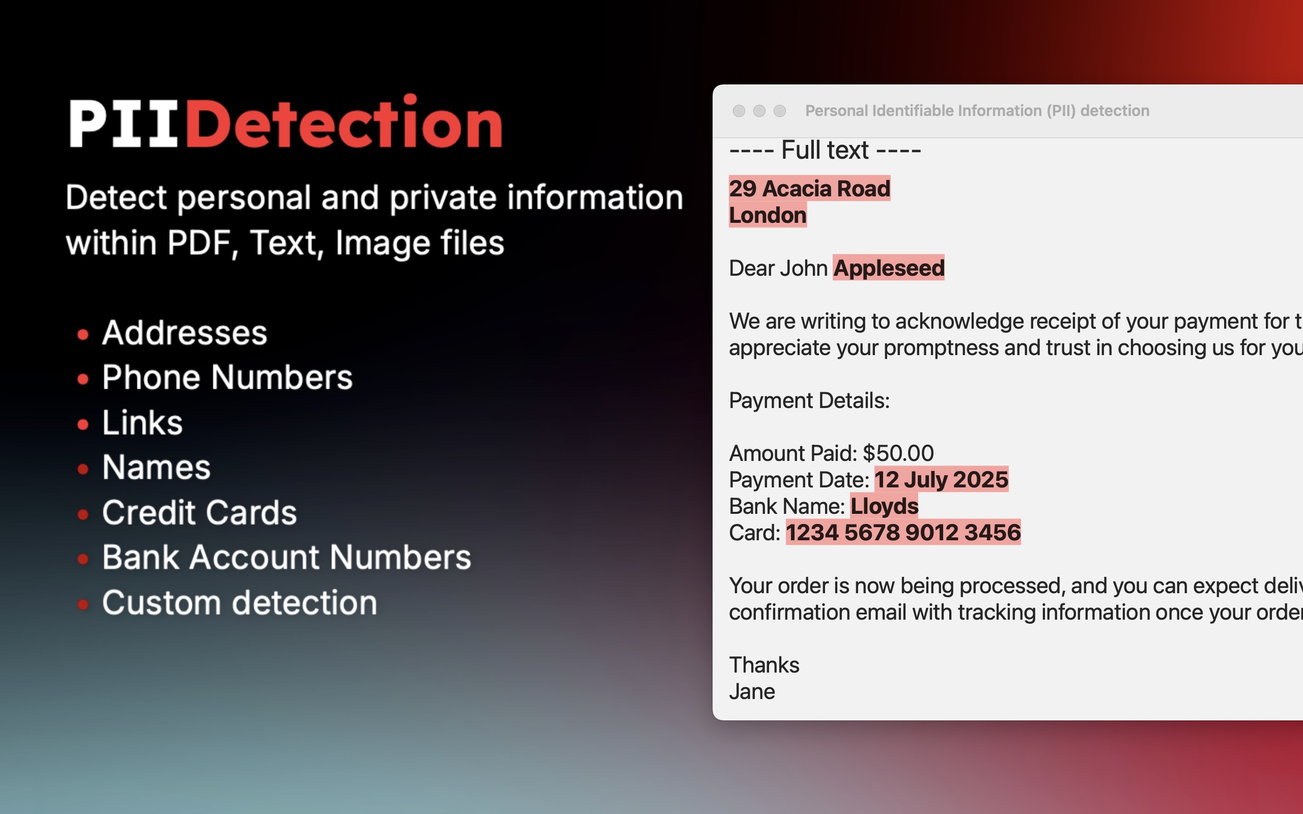 Identifying and remove personal and private information from text, PDF documents, and images on your Mac. Designed with privacy in mind, this app ensures your sensitive data remains confidential, preventing misuse by free AI tools that could exploit your information.