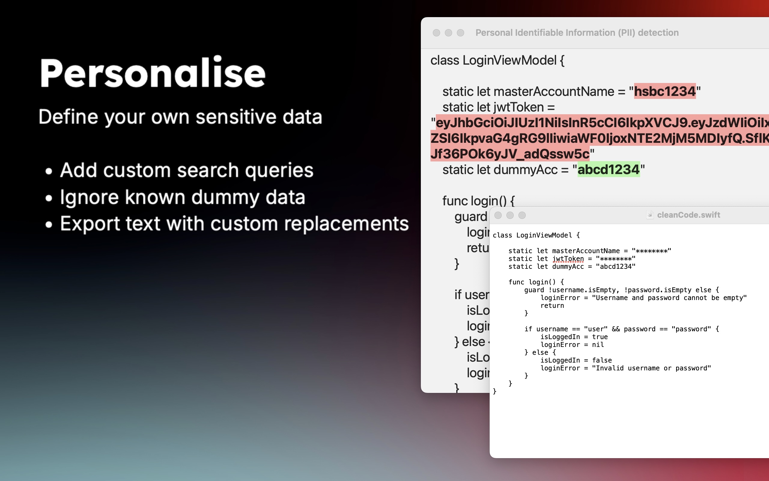 Key Features: - Comprehensive Detection: Automatically scan documents for addresses, phone numbers, links, and more. - Customisable Regex: Define your own regular expressions to detect specific patterns unique to your needs. - Ignore List: Easily exclude known dummy data from scans, ensuring accuracy and efficiency. - Secure Replacement: Export documents with automatic replacements for sensitive text, keeping your information safe. - Privacy First: No data is transfered outside of this app, guaranteeing your personal information remains secure.
